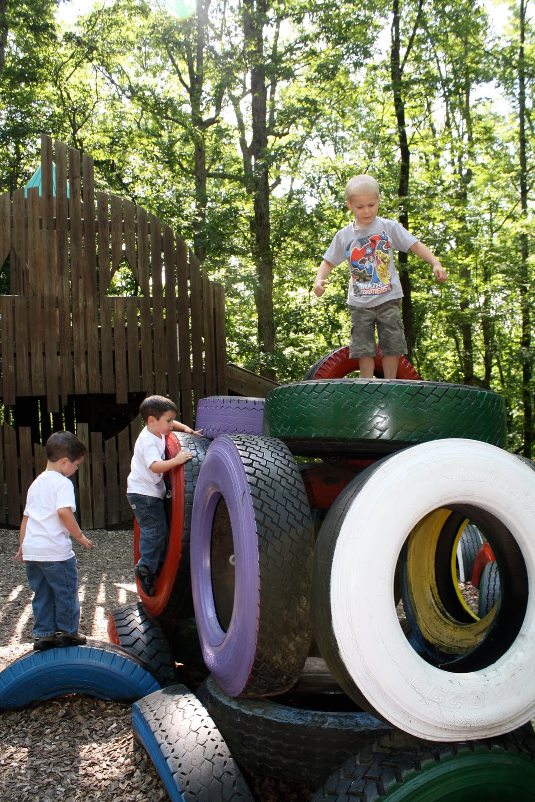 The Pumpkin Patch has several mountains of tires to climb, tire swings, regular swings, wooden forts, a climbing wall, a zip line, sandboxes, several huge slides and more!